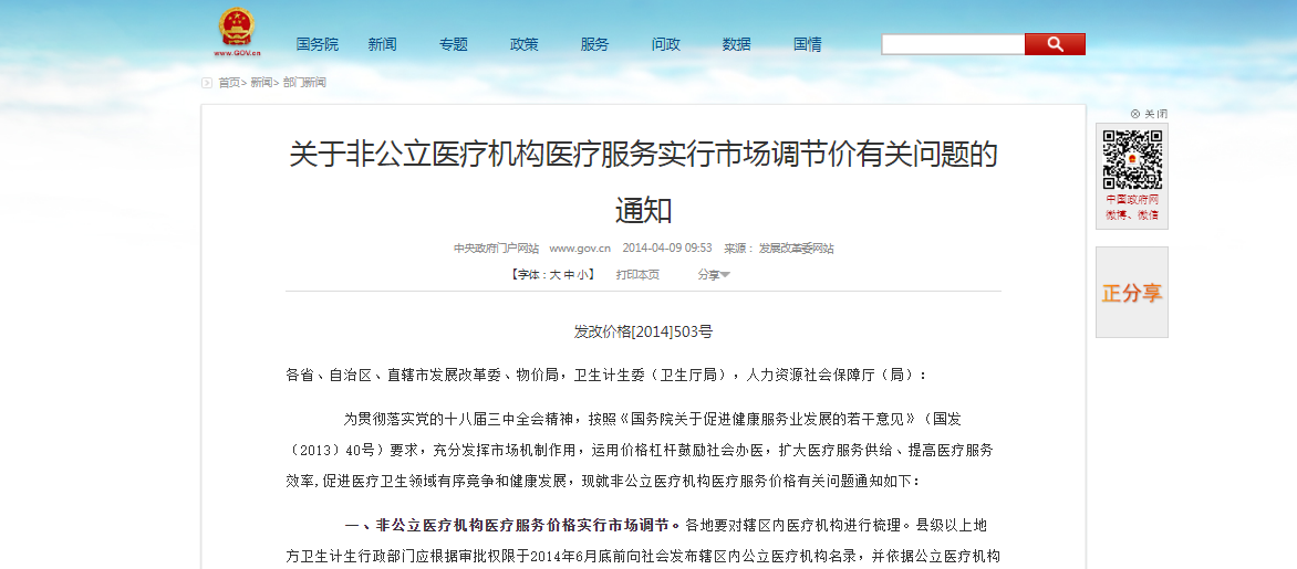 2014年3月25日,國家發展改革委發布《關于非公立醫療機構醫療服務實行市場調節價有關問題的通知》(以下簡稱《通知》)?!锻ㄖ窂娬{,為擴大醫療服務供給、提高智慧醫療服務效率,促進醫療衛生領域有序競爭和健康發展,現就非公立醫療機構醫療服務價格公布了有關問題通知。