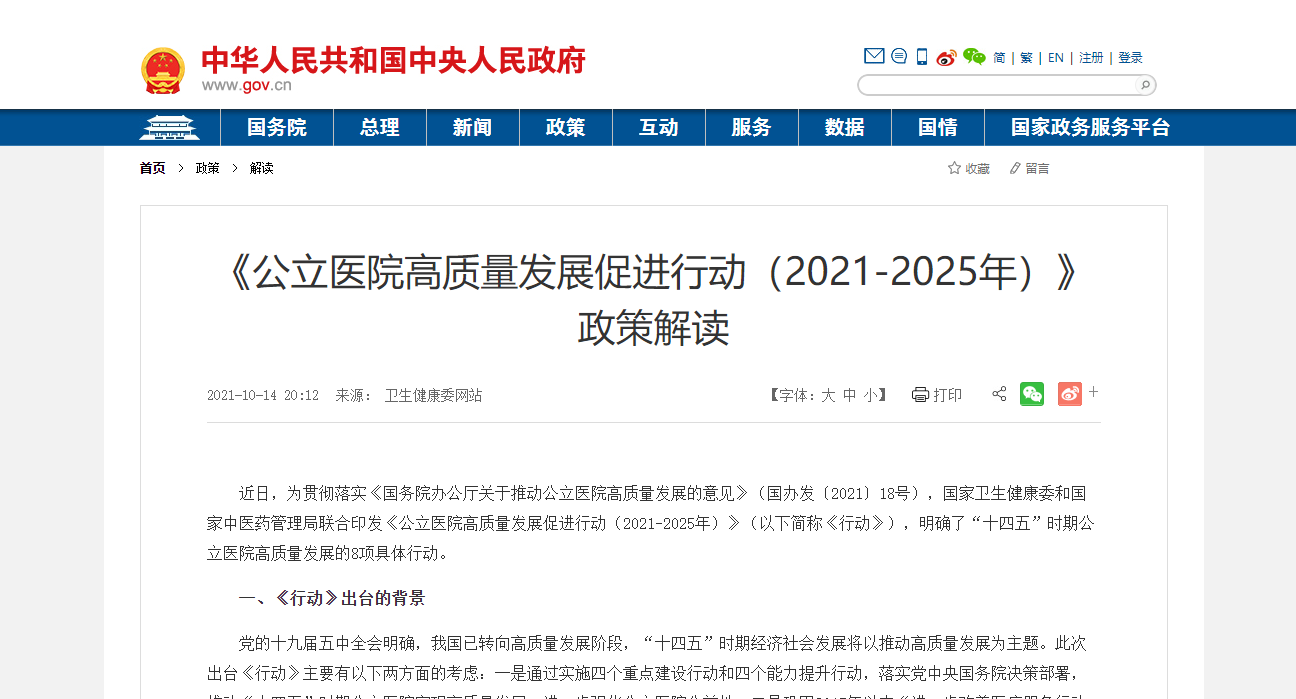 2021年9月14日,為貫徹落實《國務院辦公廳關于推動公立醫院高質量發展的意見》(國辦發〔2021〕18號),國家衛生健康委和國家中醫藥管理局聯合印發《公立醫院高質量發展促進行動(2021-2025年)》(以下簡稱《行動》),明確了“十四五”時期公立醫院高質量發展的8項具體行動。加快智慧醫療的落地進程。
