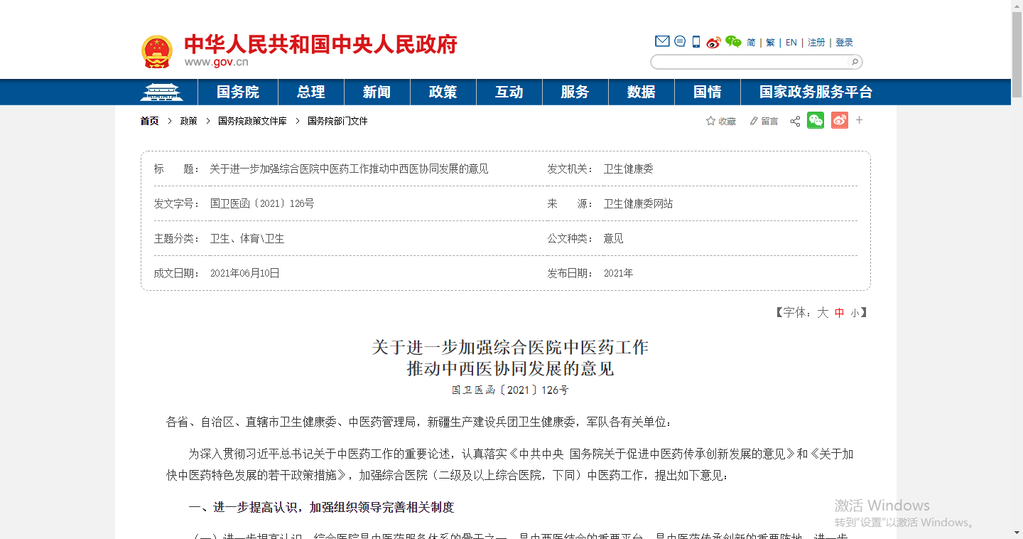2021年6月10日,為認真落實《中共中央國務院關于促進中醫藥傳承創新發展的意見》和《關于加快中醫藥特色發展的若干政策措施》,加強綜合醫院(二級及以上綜合醫院)中醫藥工作,國家衛健委等三部門發布關于進一步加強綜合智慧醫院中醫藥工作推動中西醫協同發展的意見。