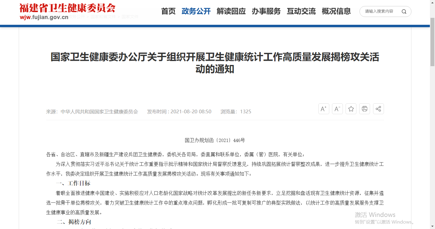 為深入貫徹落實習近平總書記關(guān)于統(tǒng)計工作重要指示批示精神和國家統(tǒng)計局督察反饋意見,持續(xù)鞏固拓展統(tǒng)計督察整改成果,進一步提升衛(wèi)生健康統(tǒng)計工作水平,我委決定組織開展衛(wèi)生健康統(tǒng)計工作高質(zhì)量發(fā)展揭榜攻關(guān)活動?,F(xiàn)將有關(guān)事項通知如下: