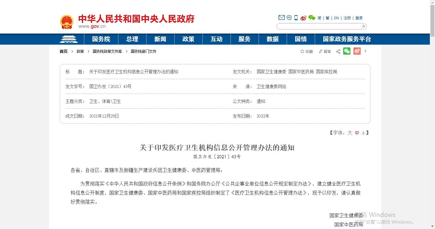為貫徹落實《中華人民共和國政府信息公開條例》和國務院辦公廳《公共企事業(yè)單位信息公開規(guī)定制定辦法》,建立健全醫(yī)療衛(wèi)生機構信息公開制度,國家衛(wèi)生健康委、國家中醫(yī)藥局和國家疾控局組織制定了《醫(yī)療衛(wèi)生機構信息公開管理辦法》,現予以印發(fā),請認真做好貫徹落實。