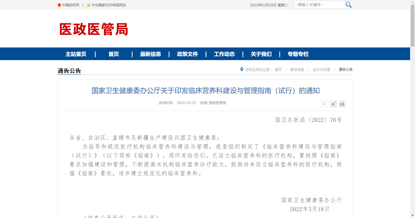 國家衛(wèi)生健康委辦公廳關(guān)于印發(fā)臨床營養(yǎng)科建設(shè)與管理指南(試行)的通知