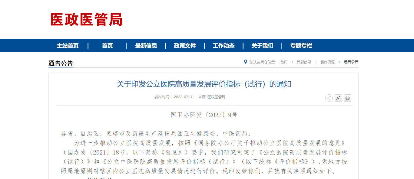 為進一步推動公立醫(yī)院高質量發(fā)展,按照《國務院辦公廳關于推動公立醫(yī)院高質量發(fā)展的意見》(國辦發(fā)〔2021〕18號,以下簡稱《意見》)要求,我們研究制定了《公立醫(yī)院高質量發(fā)展評價指標(試行)》和《公立中醫(yī)醫(yī)院高質量發(fā)展評價指標(試行)》(以下統(tǒng)稱《評價指標》),供地方按照屬地原則對轄區(qū)內(nèi)公立醫(yī)院高質量發(fā)展情況進行評價。現(xiàn)印發(fā)給你們,并就有關事項通知如下。