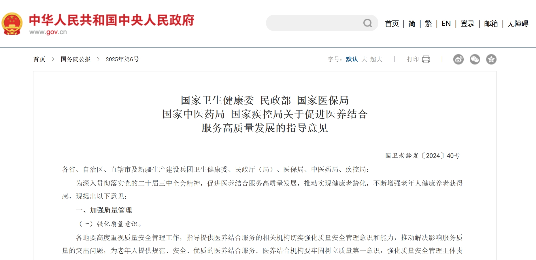 隨著我國老齡化進程的加速,如何讓老年人安享幸福晚年,成為全社會關注的焦點。在此背景下,國家衛生健康委、民政部、國家醫保局、國家中醫藥局、國家疾控局聯合印發的《關于促進醫養結合服務高質量發展的指導意見》,猶如一場及時雨,為推動醫養結合服務的高質量發展,實現健康老齡化,提供了有力的政策支撐。