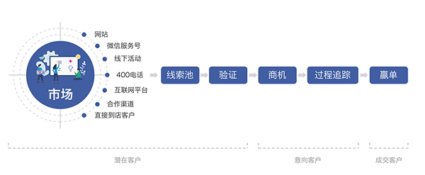 通常情況下,有健康需求的客戶通過醫療機構的官網、服務熱線、微信公眾號、互聯網平臺、線上及線下市場活動及直接到店等形式,經過創建線索、清洗查重、驗證虛實成為潛在客戶;再經過商機需求分析、人員合理分配、銷售過程追蹤成為意向客戶;銷售通過客戶畫像了解客戶需求喜好,經濟能力等,提供有針對性的分級服務,最終有可能轉化為成交客戶。