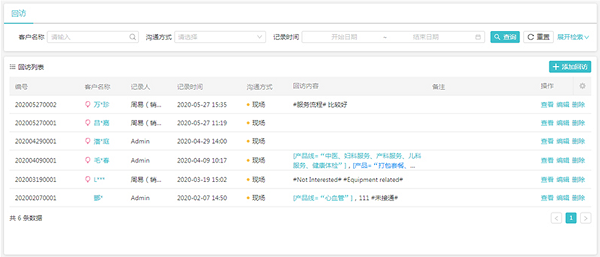 醫(yī)療機(jī)構(gòu)可以通過(guò)康博嘉醫(yī)院CRM進(jìn)行預(yù)約及排班管理,可以查看到院、離院、失約等預(yù)約視圖,查看含有客戶(hù)名稱(chēng)、電話(huà)、預(yù)約時(shí)間、預(yù)約資源等信息的預(yù)約列表。還可以查詢(xún)消息發(fā)送記錄、接收人、預(yù)計(jì)和實(shí)際發(fā)送時(shí)間、發(fā)送狀態(tài)、是否已讀等信息。其中,銷(xiāo)售回訪(fǎng)對(duì)醫(yī)療機(jī)構(gòu)拉進(jìn)與客戶(hù)之間的距離起到關(guān)鍵作用。