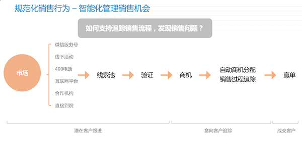 陳智承認(rèn)社會(huì)辦醫(yī)的發(fā)展道路漫長(zhǎng),尤其在疫情后市場(chǎng)環(huán)境多變的情況下,非公醫(yī)療信息化需要有新的思路以提高市場(chǎng)運(yùn)營(yíng)能力。針對(duì)這一點(diǎn),陳智將社會(huì)辦醫(yī)市場(chǎng)運(yùn)營(yíng)面臨的挑戰(zhàn)分為院前的互聯(lián)網(wǎng)利用與獲客渠道標(biāo)準(zhǔn)化,院中的優(yōu)化服務(wù)體驗(yàn),院后的客戶留存各三階段,并對(duì)此從統(tǒng)一產(chǎn)品定義、聯(lián)通市場(chǎng)渠道、規(guī)范銷售行為、建立會(huì)員服務(wù)體系、集中服務(wù)溝通、加強(qiáng)數(shù)據(jù)分析六方面闡明了康博嘉醫(yī)院CRM系統(tǒng)對(duì)優(yōu)化醫(yī)院客戶關(guān)系管理、夯實(shí)醫(yī)院信息化建設(shè)的助力: