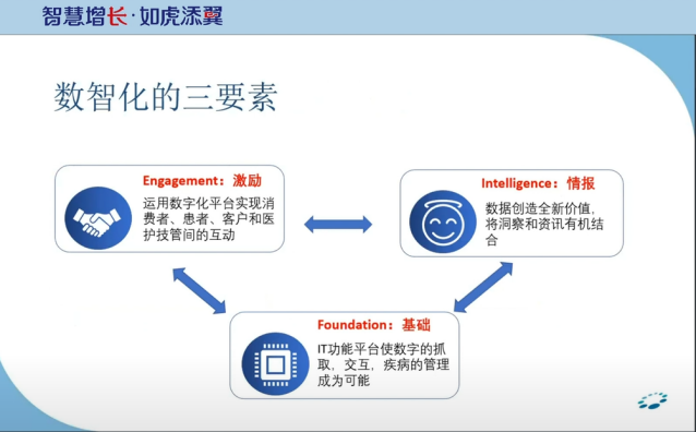基礎(chǔ)(Foundation)是指硬件、軟件的布局,更偏向上一部分中關(guān)于數(shù)字化的介紹;洞察(Intelligence)是指運(yùn)用數(shù)據(jù)創(chuàng)造全新價(jià)值;而激勵(Engagement)則是綜合運(yùn)用數(shù)字化平臺實(shí)現(xiàn)消費(fèi)者、患者、客戶和醫(yī)護(hù)技管的有效互動。