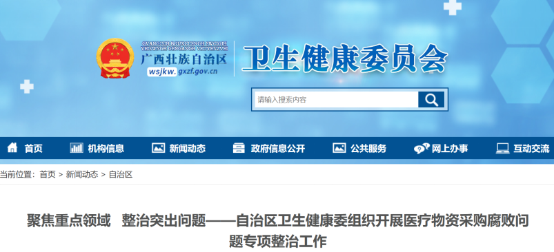 近日,廣西衛(wèi)健委發(fā)布文件,要開展自治區(qū)內(nèi)的醫(yī)療物資采購腐敗專項(xiàng)整治問題。