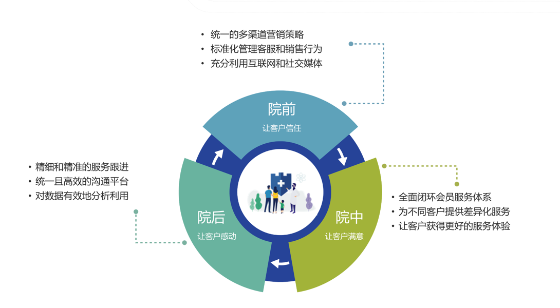 醫院運營者要考慮到,在健康消費需求日趨多樣化、個性化的今天,患者體驗是全方位、多維度的,不能將視野局限于院內的硬件設施與醫療服務,更應將其蘊含在院前及院后的溝通中。有效的患者運營應該具備一站式溝通服務中心,令患者能夠在診療前更省心地預約,到院時不需對不同接待者重復相同的話,也意味著患者在診療后能夠從心里感受到醫院對患者的主動式關懷。