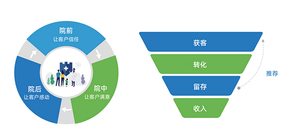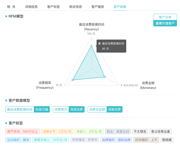 會員管理的基礎性工作是認清用戶。系統獲取基本數據和行為數據后,醫療機構知道客戶的年齡、職業、客戶喜好,購物類型等,完成消費等級的劃分;還可以標注有無過敏源,有無慢性病,形成完整的畫像標簽,為客戶推薦更合適的產品和服務。同時為管理者提供戰略支持,而這些戰略滿足用戶需求后讓用戶產生二次消費興趣,豐富用戶體驗,以此來保持穩定的用戶生存周期。所以,民營醫院打系統戰的首要任務就是從醫院系統層面,把這些基礎的信息搭建好,對客戶信息的經營管理才能為接下來的突圍做保障。