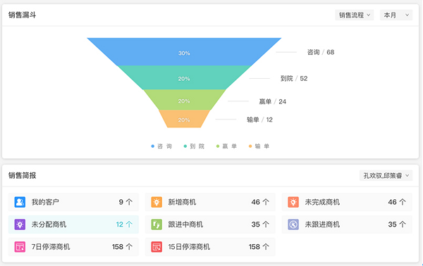 康博嘉醫(yī)院CRM能夠匯總銷(xiāo)售機(jī)會(huì),幫助銷(xiāo)售把握客戶需求,預(yù)測(cè)銷(xiāo)售形勢(shì),便于合理分配銷(xiāo)售資源,梳理把控銷(xiāo)售跟單過(guò)程,及時(shí)調(diào)整止損,做好團(tuán)隊(duì)配合,提升訂單轉(zhuǎn)化率。