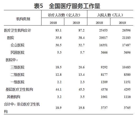 (一)門診和住院量。2019年,全國醫療衛生機構總診療人次達87.2億人次,比上年增加4.1億人次(增長4.9%)。2019年居民到醫療衛生機構平均就診6.2次。