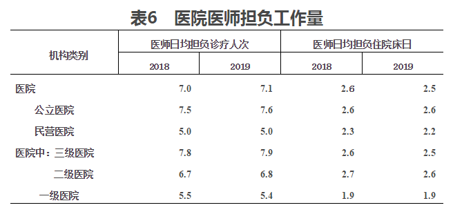 (二)醫院醫師工作負荷。2019年,醫院醫師日均擔負診療7.1人次和住院2.5床日,其中:公立醫院醫師日均擔負診療7.6人次和住院2.6床日(見表6)。