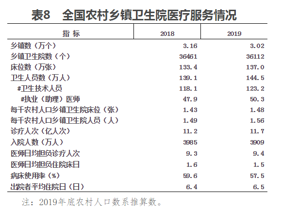 2019年,鄉鎮衛生院診療人次為11.7億人次,比上年增加0.5億人次;入院人數3909萬人,比上年減少75萬人。2019年,醫師日均擔負診療9.4人次和住院1.5床日。病床使用率57.5%,出院者平均住院日6.5日。與上年相比,鄉鎮衛生院醫師工作負荷比較穩定,病床使用率下降2.1個百分點,平均住院日比上年延長0.1日。