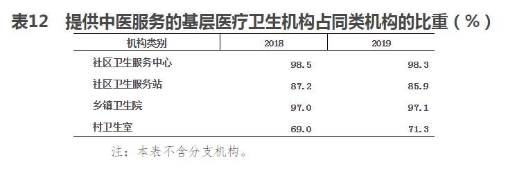 2019年末,提供中醫服務的社區衛生服務中心占同類機構的98.3%,社區衛生服務站占85.9%,鄉鎮衛生院占97.1%,村衛生室占71.3%(見表12)。