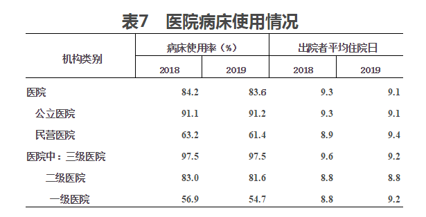 (三)病床使用。2019年,全國醫院病床使用率83.6%,其中:公立醫院91.2%。與上年比較,醫院病床使用率下降0.6個百分點(其中公立醫院上升0.1個百分點)。2019年醫院出院者平均住院日為9.1日(其中:公立醫院9.1日),醫院出院者平均住院日比上年略有下降(見表7)。