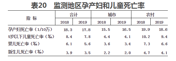 (三)孕產婦死亡率。據婦幼衛生監測,2019年,全國孕產婦死亡率為17.8/10萬,其中:城市16.5/10萬,農村18.6?/10萬。與上年相比,全國孕產婦死亡率有所下降(見表20)。