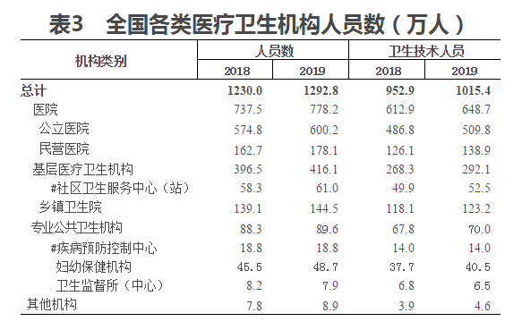 (三)衛生人員總數。2019年末,全國衛生人員總數達1292.8萬人,比上年增加62.8萬人(增長5.1%)。