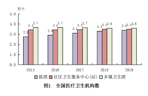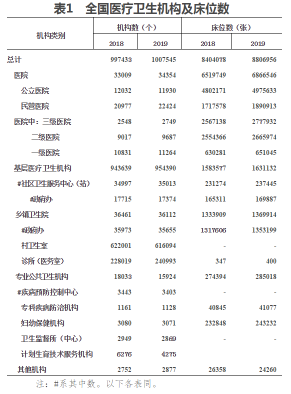 (一)醫療衛生機構總數。2019年末,全國醫療衛生機構總數達1007545個,比上年增加10112個。其中:醫院34354個,基層醫療衛生機構954390個,專業公共衛生機構15924個。與上年相比,醫院增加1345個,基層醫療衛生機構增加10751個(見表1)。