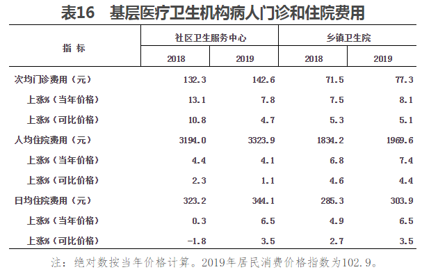(二)基層醫療衛生機構病人醫藥費用。2019年,社區衛生服務中心次均門診費用142.6元,按當年價格比上年上漲7.8%,按可比價格上漲4.7%;人均住院費用3323.9元,按當年價格比上年上漲4.1%,按可比價格上漲1.1%(見表16)。