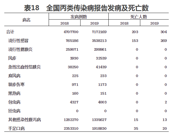 2019年,全國丙類傳染病報告發病率為513.6/10萬,死亡率為0.02/10萬。