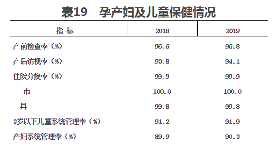 (一)婦幼保健。2019年,孕產婦產前檢查率96.8%,產后訪視率94.1%。與上年比較,產前檢查率和產后訪視率均有提高(見表19)。2019年住院分娩率為99.9%(市100.0%,縣99.8%),與上年持平。
