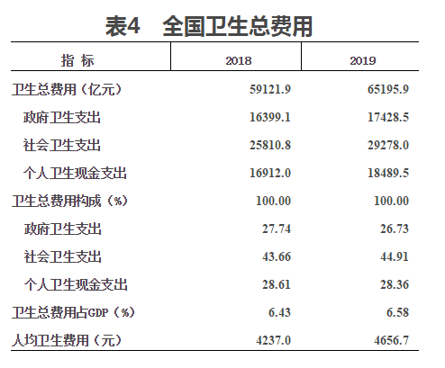 (四)衛生總費用。2019年全國衛生總費用預計達65195.9億元,其中:政府衛生支出17428.5億元(占26.7%),社會衛生支出29278.0億元(占44.9%),個人衛生支出18489.5億元(占28.4%)。人均衛生總費用4656.7元,衛生總費用占GDP百分比為6.6%(見表4)。