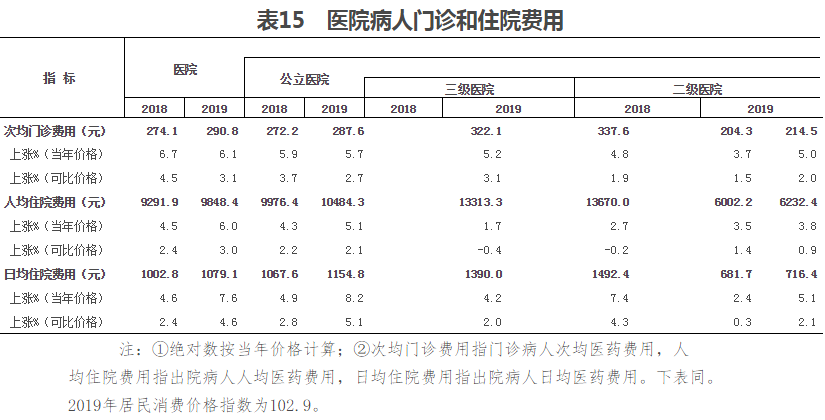 (一)醫院病人醫藥費用。2019年,醫院次均門診費用290.8元,按當年價格比上年上漲6.1%,按可比價格上漲3.1%;人均住院費用9848.4元,按當年價格比上年上漲6.0%,按可比價格上漲3.0%。日均住院費用1079.1元(見表15)。