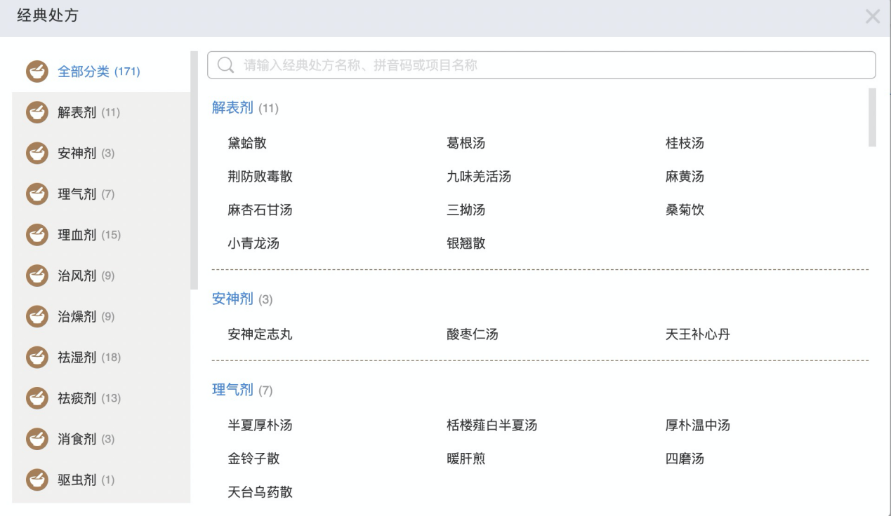 第2步,在經典處方集中,醫生可以根據功用、治法或搜索快速定位所需處方,醫生用鼠標懸浮在處方名上時,即可查看該處方組成: