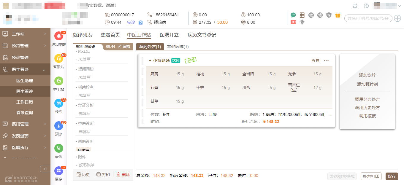 第1步,醫生在進入中醫工作站后,一目了然可見“調用經典處方”功能: