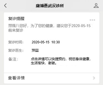 對于未能在第一時間建立預(yù)約的患者,也不宜強求。醫(yī)生在告知其復(fù)診的必要性之后,可以通過門診管理系統(tǒng)新建復(fù)診提醒來起到督促患者的作用。患者在收到提醒后,可點擊【查看詳情】直接前往預(yù)約。