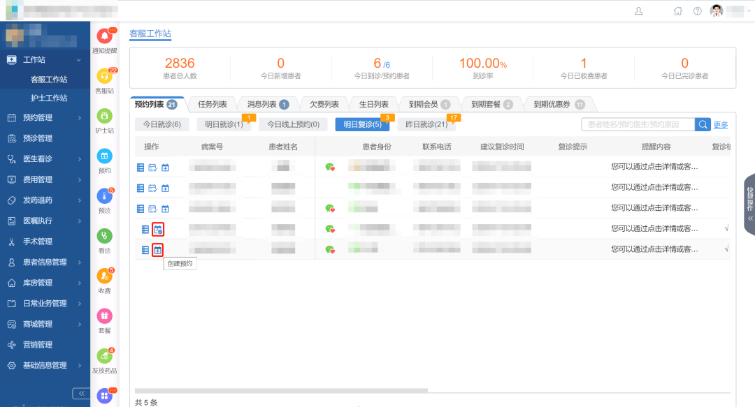 咱們的客服人員可以在門診管理系統(tǒng)中的【客服工作站】的【明日復(fù)診】版塊,快捷篩選出原定明天(或某一天)要來診所復(fù)診的患者名單,通過微信或者電話的形式與患者進行溝通,進而為咱們提高復(fù)診率,再上一道保險。