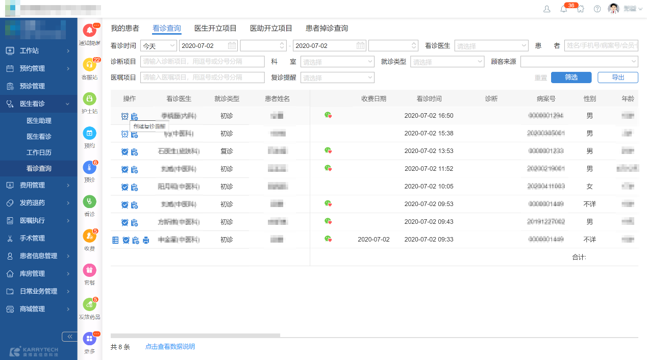 一套科學(xué)完善的機制中,查漏補缺是必不可少的。如果醫(yī)生當(dāng)天看診比較忙碌,在一天工作快要結(jié)束的時候,也可以通過門診管理系統(tǒng)中的【看診查詢】頁面,對當(dāng)天自己看診的患者的復(fù)診新建、復(fù)診提醒進行檢查。診所經(jīng)營者也可以通過此頁面,來核查的相關(guān)工作的完成情況。