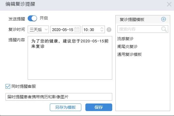 醫(yī)生可在門診管理系統(tǒng)中自行編輯復(fù)診時間和提醒內(nèi)容。新建復(fù)診提醒后,信息會同步到客服處,系統(tǒng)會自動提前一天通過微信或者短信提醒患者前來復(fù)診。避免因時間跨度長、患者遺忘等因素影響復(fù)診率。