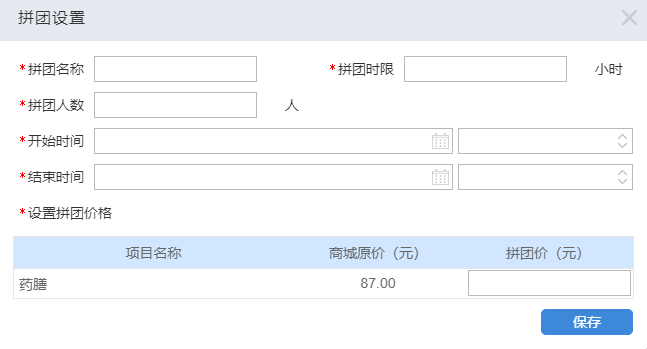 首先地一步步,進入【拼團設置】頁面,按照提示設置拼團規則。比如拼團的人數、時間限制、開始結束時間以及拼團價格這些信息。