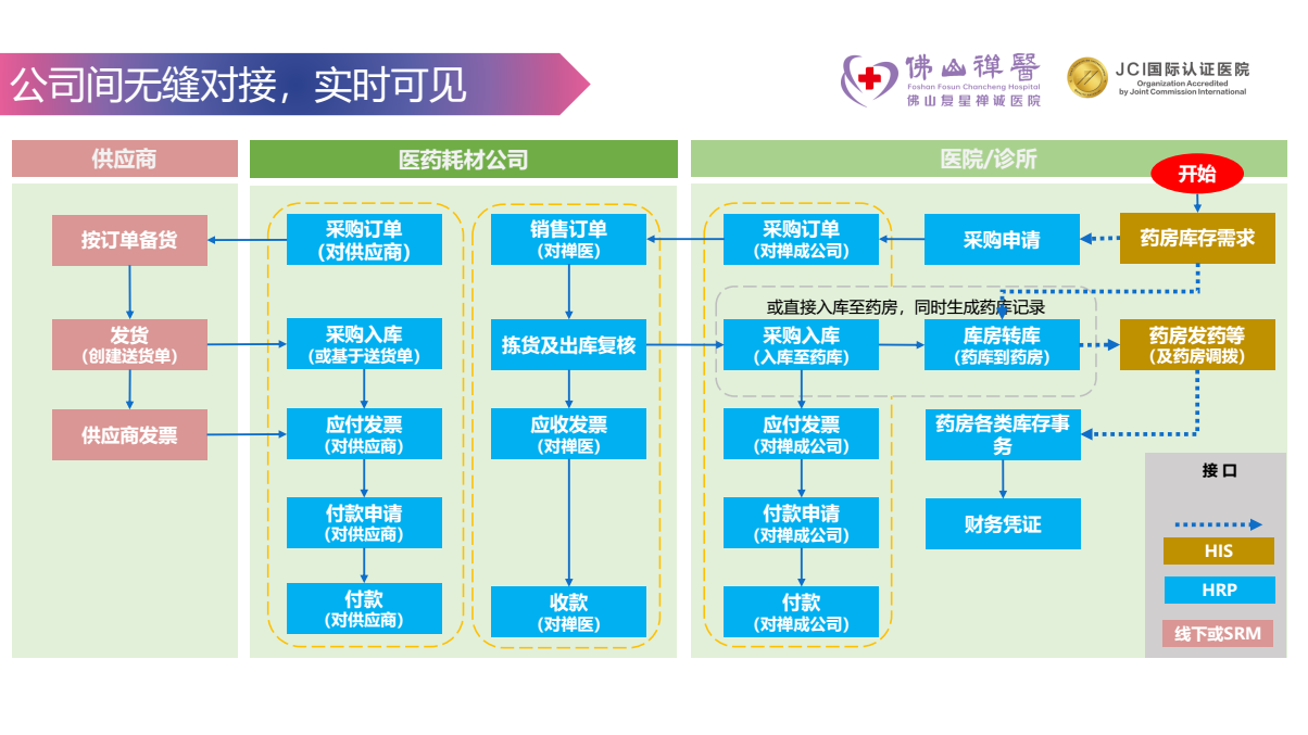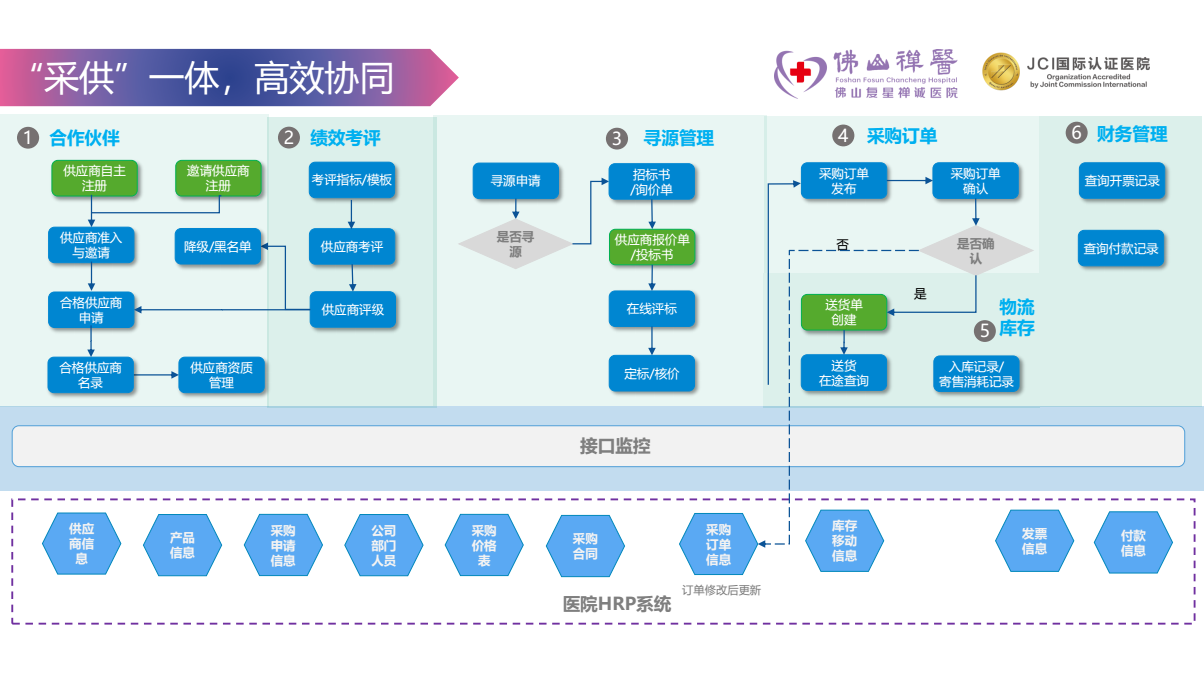 通過HRP打通的SRM供應(yīng)商關(guān)系管理平臺,禪醫(yī)能與大量優(yōu)質(zhì)供應(yīng)商在線協(xié)同,實現(xiàn)對供應(yīng)商從準(zhǔn)入、績效評級、尋源到采供一體的全流程管理。