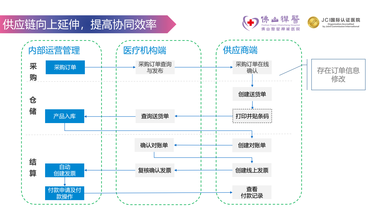 整合供應(yīng)商端、醫(yī)療機構(gòu)端、內(nèi)部使用層的信息管理,讓信息調(diào)取及流轉(zhuǎn)自動化,跟隨業(yè)務(wù)產(chǎn)生可追溯的單據(jù)、發(fā)票,讓協(xié)同更加高效。