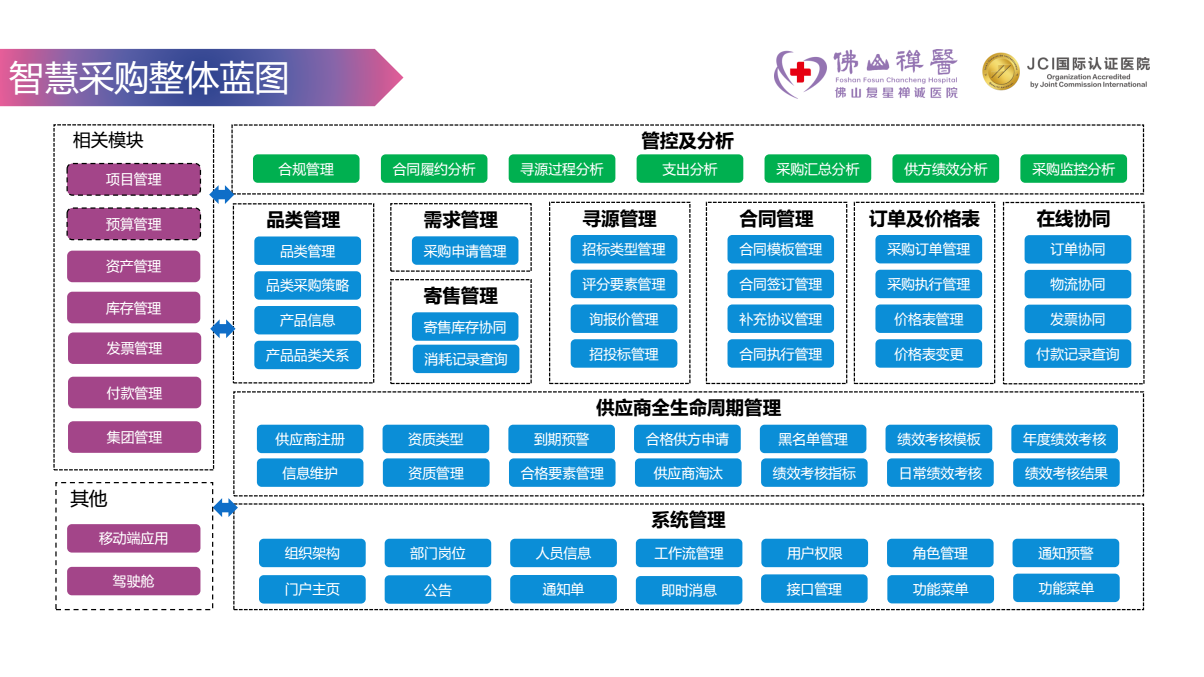 下面,就讓我們來看一看,禪醫(yī)如何通過康博嘉HRP平臺+SRM供應(yīng)商關(guān)系管理SaaS平臺,搭建全流程的智慧采購體系,實現(xiàn)集團化管控下,針對各個機構(gòu)、各類物資、大量供應(yīng)商的統(tǒng)一管理。