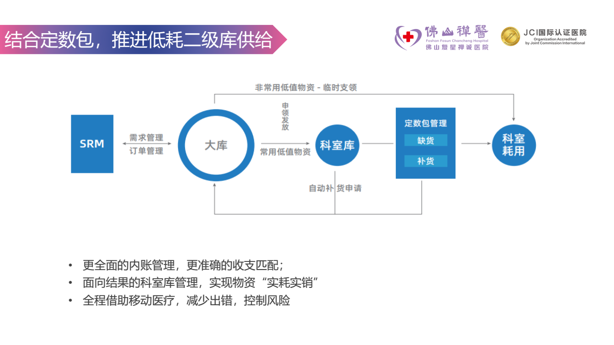康博嘉HRP支持臨床科室采用二級庫管理低值耗材,設(shè)立庫存基數(shù),實現(xiàn)達到補貨點時HRP自動補貨,并利用條碼技術(shù)等,達到物資“實耗實銷”,實時記錄,更全面、準(zhǔn)確地實現(xiàn)收支匹配與內(nèi)帳管理。