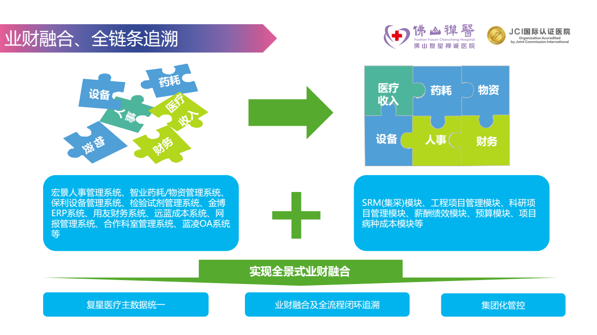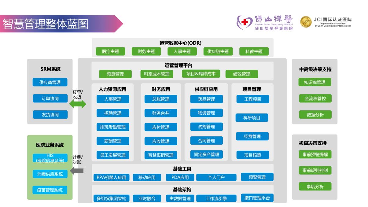 禪醫(yī)使用的康博嘉HRP平臺集成了院內(nèi)已有的不同模塊、不同廠商的多個異構(gòu)管理系統(tǒng),并增加原來缺少的工程、科研項目管理模塊、集采、薪酬績效、預(yù)算、全成本管理模塊等,實現(xiàn)了主數(shù)據(jù)統(tǒng)一、集團化管控的便捷,及全流程閉環(huán)追溯的防風(fēng)險管控。