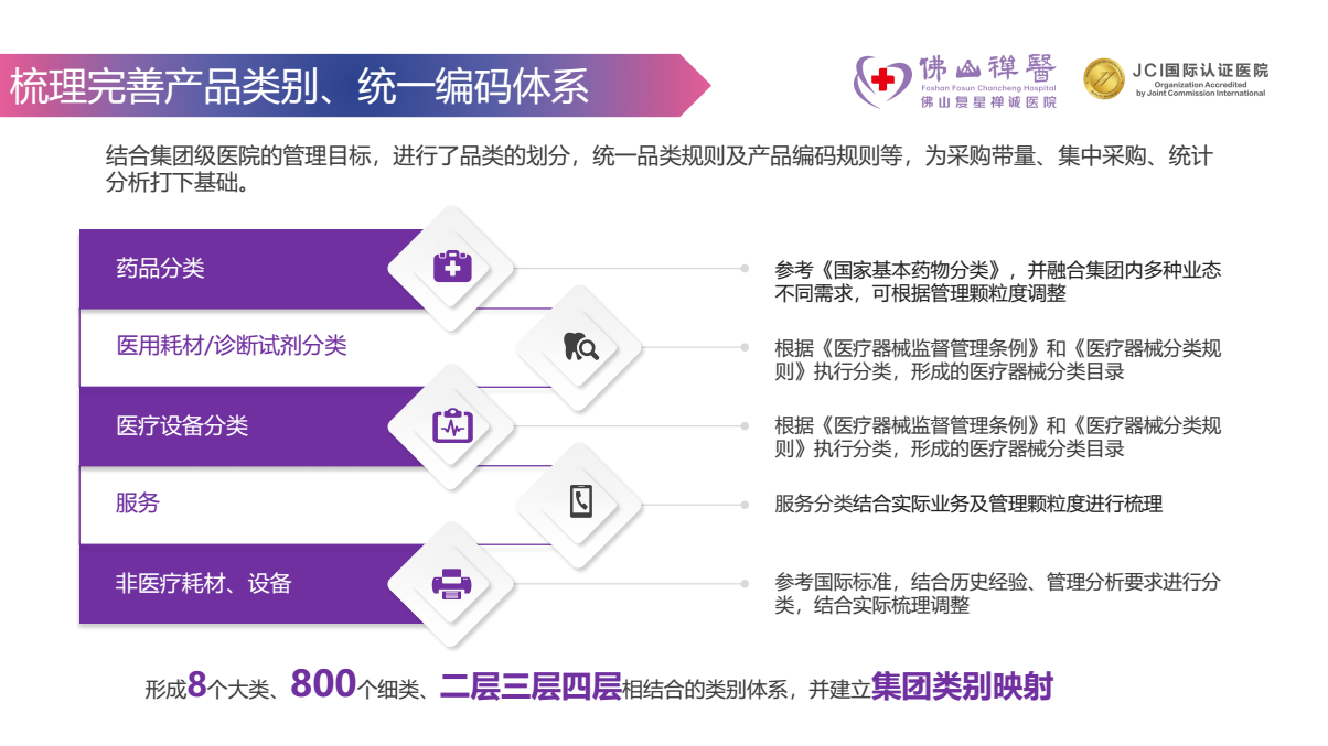 作為復(fù)星醫(yī)療集團旗下的醫(yī)院,禪醫(yī)結(jié)合集團級醫(yī)院的管理目標(biāo),進行了品類的劃分,統(tǒng)一品類規(guī)則及產(chǎn)品編碼規(guī)則等,形成了8個大類、800個細類、二層三層四層相結(jié)合的類別體系,并建立集團類別映射,為帶量采購、集中采購、統(tǒng)計分析打下堅實的基礎(chǔ)。