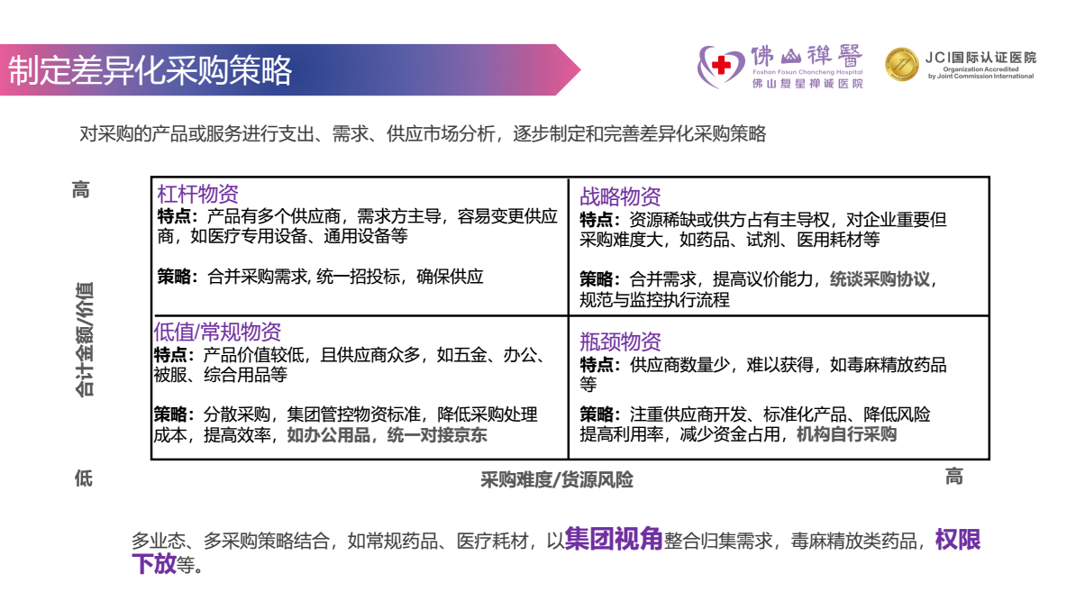 禪醫(yī)對采購的產(chǎn)品/服務(wù)進行支出、需求、供應(yīng)市場的分析,以此實現(xiàn)多業(yè)態(tài)、多采購差異化策略的有機結(jié)合。比如,對于常規(guī)藥品、醫(yī)療耗材,以集團視角整合歸集需求;對于毒麻精放等藥品,則做到院級權(quán)限下放。