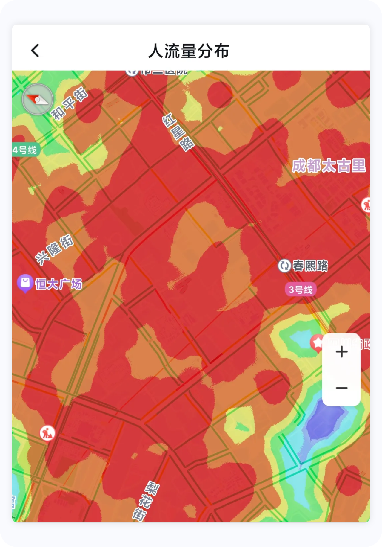 能夠清晰看到區域內人流量情況,顏色越紅,人流量越大。