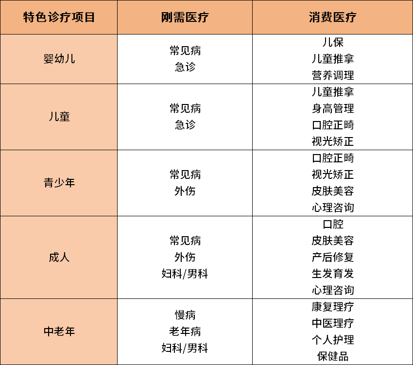 第一個問題,診所一般分為普通診所、中西醫結合診所、中醫診所、口腔和醫美類診所,分別對應了客戶的剛需醫療和消費醫療。診所創業者需要通過自己的執業范圍和發展方向選擇合適的診所類型。