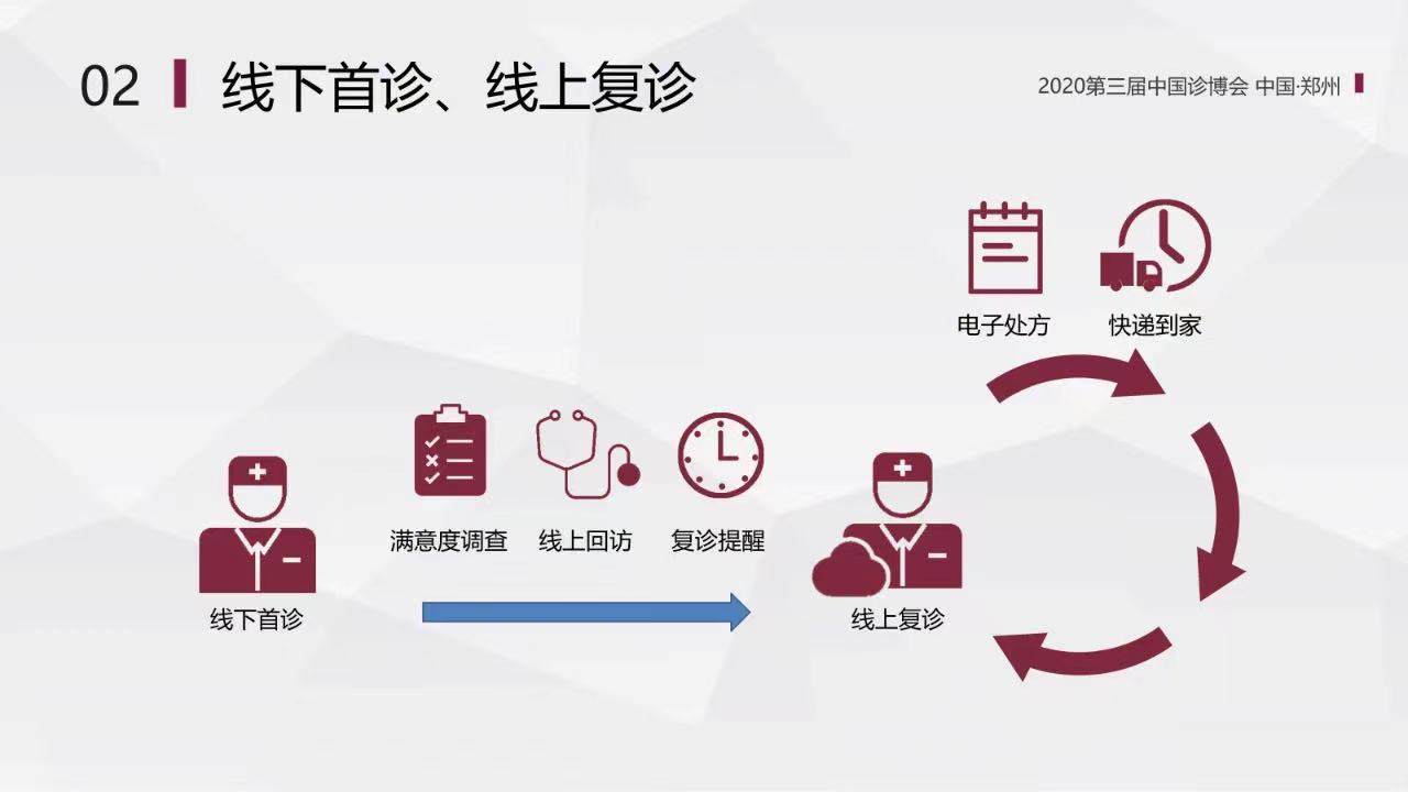 “線下首診、線上復診”。線下完成首診后,促進患者去線上復診。良好的線上看診體驗,可以推動患者下一次線上復診的再預約,從而實現了線下首診、線上復診的閉環。這樣的新模式,打破了患者就醫的時間、空間的限制,有效提升了預約的到診率。