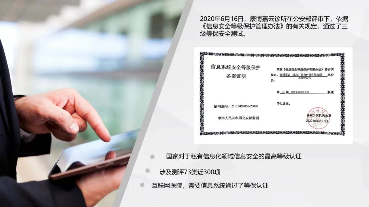 康博嘉云診所醫療軟件搭建了3地4中心的服務器架構,打造6大安全體系,覆蓋了云診所的方方面面,讓每個方面都有足夠的安全保障。2020年康博嘉云在國家公安部的評審下,通過了信息安全三級等保認證。