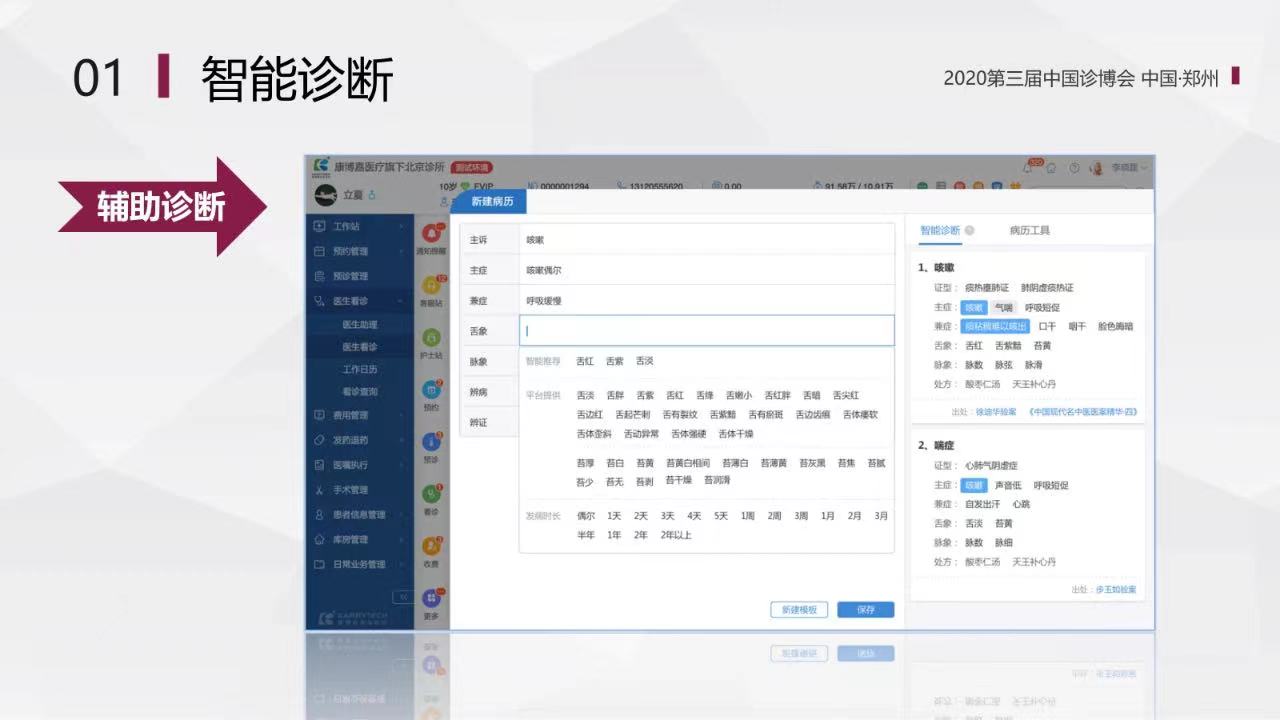 智能診斷方面,康博嘉云診所醫療軟件基于大數據,結合八綱辨證、臟腑辨證等臨床常用辨證方法,智能推薦出病名、證型來輔助醫生診斷;落方過程中,本著辨證論治的原則,基于古今醫案中證型與經方的關系,再結合醫生個人常用處方習慣,智能推薦最佳治療方案,輔助醫生落方。