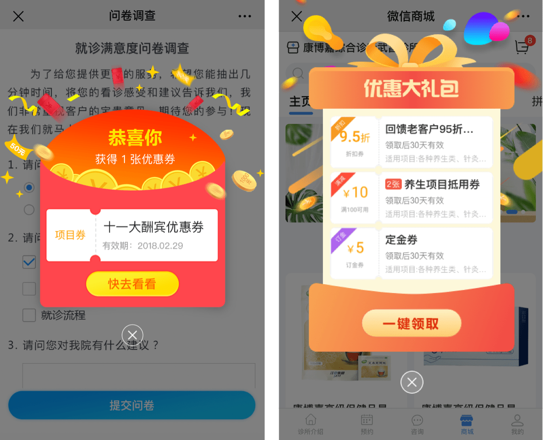 商城彈窗贈券→客戶登錄微信商城主頁時,可領取優惠券。