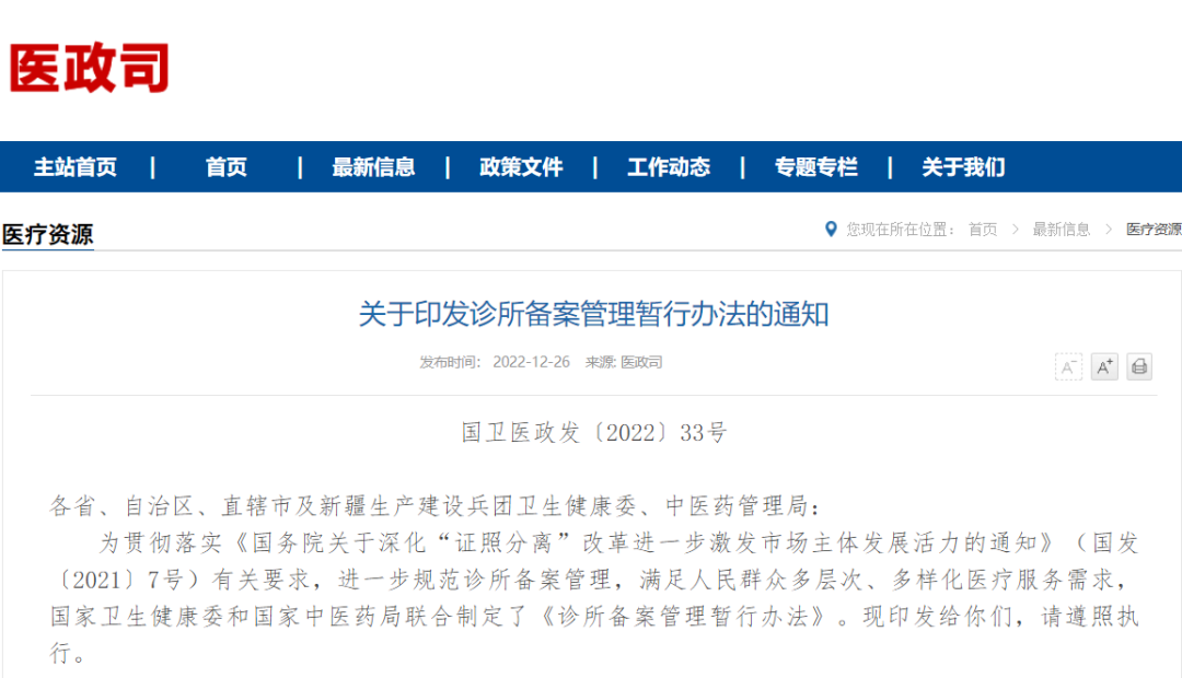 2022年12月26日,衛健委聯合中醫藥管理局發布了《診所備案管理暫行辦法》和《診所基本標準2022》。